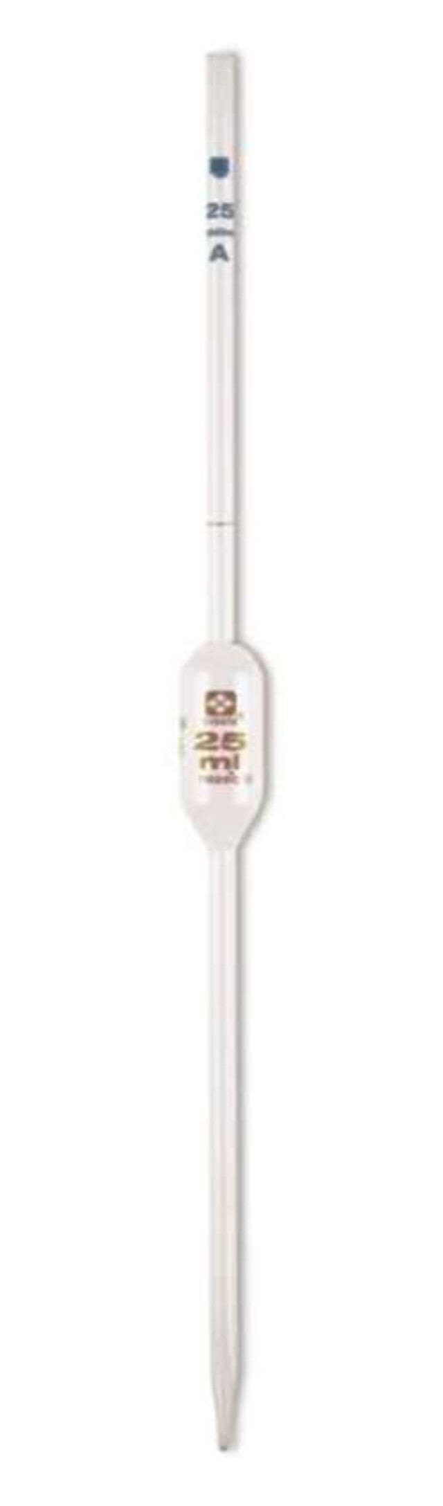 Volumetric pipettes are graduated to the tip and made out of high-quality borosilicate glass. These pipettes also have graduation markings and color-coded bands that are permanently enameled to the glass which allows for quick identification of different volume ranges.